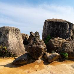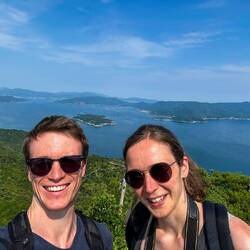 Towards the top there are some larger boulders that provide spectacular views. Having finally reached the summit, we sit down to catch our breath in a beautiful construction. We take in the views spanning from the coastline and Hiroshima to the ocean and little islands.