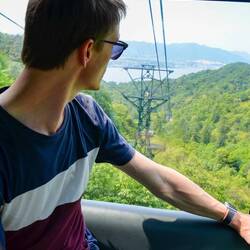 Having concluded most of the main must-sees on the island, we decide to finish our day with a hike up to the summit of Mt. Misen. There are two ways to reach the top: some walking trails that estimate to take between 1,5h and 2h to reach the top, or via a cable car. Because it's both warm and we're a bit unsure of the time it will take us to get up there, we decide on taking the cable car up, and walking back down. The cable car base station is at the other side of the town, so we first have to walk a bit to reach it. On the way, we walk through some forest-like parks with deer and a little waterfall. Having bought our one-way ticket up, we board the cable car. In the mid-station, we have to switch to a larger car that takes us to the top station. The views on the way up are already spectacular, but we can't take any pictures in the second car because we're too cramped together. Having arrived at the top, there are frequent announcements to say how long you still have to walk to reach the actual top of the mountain, and when the last cable car is going back down. If you miss it, you'll have to walk back down. And somehow, I get the feeling that - being submerged in Japanese culture for 11 days now - they mean it.