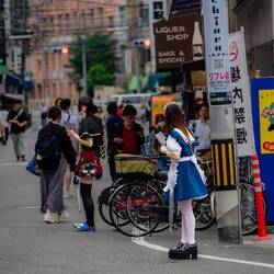 In the middle of the street, there are some girls all dressed up in special costumes for cosplay. We had to do some research on what's exactly the concept of it all, but hey, it's Japan: anything is possible here. You can - for example - pay a girl dressed as your favorite game character to join you for a couple of hours and have a drink together or go and play some games in a luna park.