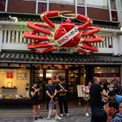 You can't really miss the street to our left that is Dotonbori. The number of tourists is overwhelming. As we make our way through the street, we have constantly have to move our attention from not hitting oncoming tourists, to the amazing and huge storefronts in the street. Most of them are restaurants and have an absolutely humongous sculpture of their food or anything other that attracts the eye hanging in front. Of course, there's the moving crab (actually, there are many).
