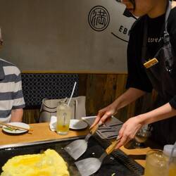 Having tried some appetizers, we move on to the next location where we’ll try the okonomiyaki. There will be two variants of which we’ve eaten one before. The tables are equipped with a heated plate in the middle and an employee prepares the food at the table. Some real show cooking!