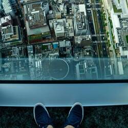 In no time the elevator rushes to the 350th floor and we're welcomed by an amazing view over the city. On a clear day, you can even see Mt. Fuji from here. But unfortunately, there are too many clouds or it's too hazy to see the famous mountain. Nevertheless, the vast city underneath our feet is equally impressive! We go around, enjoy the views and go further to the 450m. Which is... in my opinion little difference from the 350m. On the way down you make another stop at the intermediate floor where there's a glass floor section as well where you can stand on.