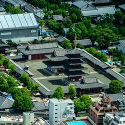 As we exit the castle/museum’s grounds via the surrounding parc, we have a seat on a bench in the shade to plan our next move. We have to be in time for the food tour, so it’s little use to travel all around the city to hop back on the subway a few minutes after we arrive to make it in time. We decide to visit the temple of Shitennoji. One of the oldest in Japan but also a replica as the original has burned down a couple of times already. In the streets surrounding the temple complex there is a weekly market going on. Because of the market, the inside buildings are free to visit. Lucky us!