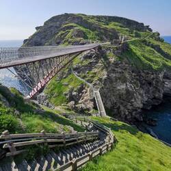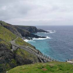 Ich fand einen Parkplatz, machte mir noch kurz ein Sandwich to go und lief den steilen Weg nach unten Richtung Tintagel Castle. Ich wollte erstmal die Gegend drumherum ein bisschen erkunden und bog dafür auf den Caostel Trail ab. Von hier hatte man einen schönen Blick auf die lange Brücke, die Insel auf der sich die Reste der Burg befinden und die Steilküste.