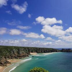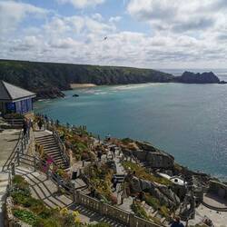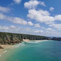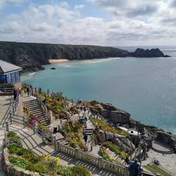 WOOOW, was für ein Ausblick!!! Direkt von hier oben hatte man einen wahnsinns Blick über das gesamte Amphitheater, das Meer und den paradiesischen Porthcurno Beach mit türkisblauen Wasser ringsrum. Da sagt nochmal einer in England wäre es nur kalt und trüb! Wahrscheinlich ist das gerade wirklich nicht die Norm und zu lange bin ich ja auch noch nicht unterwegs, aber bislang habe ich einfach NUR perfektes Wetter gehabt und das hier vor mir hätten auch die Malediven sein können, ich hätts geglaubt - aber nein, so kann es wohl auch in England aussehen, einfach nur gigantisch ☀️☀️☀️