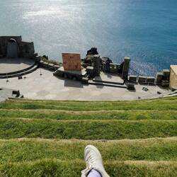 Ich machte mir ein schnelles Müsli und plante in der Sonne sitzend die weitere Route. Das Amphitheater, das ich mir unbedingt ansehen wollte, würde bis zu meiner Ankunft heute geschlossen sein. Ich buchte ein Ticket für den nächsten Tag und fuhr anstelle davon erst zum Tintagel Castle. Dabei ging es auf der Fahrt ganzschön spannend zu. Die Straßen wurden immer enger, bis sie eigentlich nurnoch die Breite für ein Auto hatten. Gegenverkehr kam trotzdem - und wie der kam😱 - und teilweise musste ganzschön rangiert werden, um aneinander vorbei zu kommen.