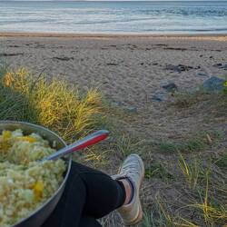 Schnell das Zelt aufgeschlagen und den Kocher angeworfen. Mein Magen hing schon durch, umso leckerer schmeckten meine Nudeln dann, die ich in der Abendsonne genießen konnte.