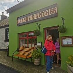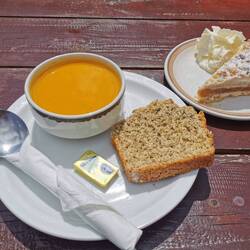 Ich ging gemütlich weiter und nahm unten noch den kleinen Restschlenker vom Lower Diamond Hill Walk mit bis zum Besucherzentrum zurück. Hier hatte ich vorhin schon einen Tea Room erspäht und wollte sehen, was sie Leckeres im Angebot hatten - was hier in Irland echt toll ist, es gibt einfach üüüberall (wirklich auch MITTEN in der Pampa) kleine Cafés mit selbstgebackenen Kuchen. Ich entschied mich für die Tagessuppe und einen Rhabarber-Erdbeer-Crumble-Kuchen 🤤🤗