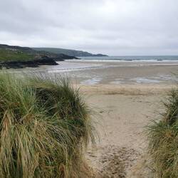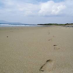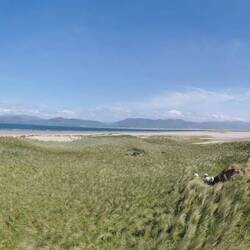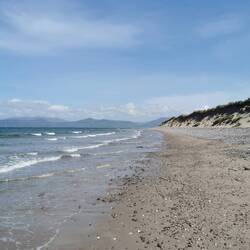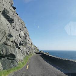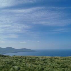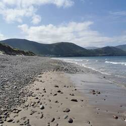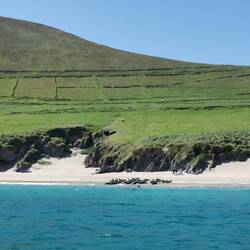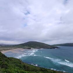 Es ging weiter auf dem Ring of Kerry, vorbei an wunderschönen Küstenabschnitten bis zum Rossbeigh Beach. Auf der einen Seite bestand er eigentlich nur aus großen Kieseln, ich lief ein bisschen durch die Dünen und bis ganz nach hinten, wo die lange Sandzunge ins Meer ragt. Hier überraschte ich ein paar Schäfchen, die durch die Dünen marschierten und protestierten. Ich wechselte zur anderen Strandseite, hier war dieser riesige weiße Sandstrand und kein Mensch weit und breit - wow! Da es hier auch fast windstill war, machte ich es mir im Sand gemütlich und frühstückte :) Danach spazierte ich gemütlich zurück und fuhr weiter zum Bín Bán, einem Aussichtspunkt auf den Klippen von dem aus man einen super Blick hat und mit Glück Delfine beobachten kann - ich werde zwar hoffentlich morgen welche aus der Nähe sehen können, aber schadet ja nichts, jetzt schon mal einen Blick zu riskieren :) Einen schönen Blick gab's definitiv, Delfine leider keine und der Wind verscheuchte mich schnell wieder von den Klippen.