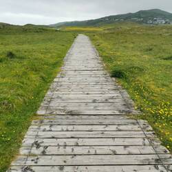Der erste Stop heute war der Baltimore Beacon - ein wie eine Rakete aussehender Turm am südlichen Ende der Insel. Die Klippen und der Ausblick waren beeindruckend - wie sich die Felsen schichtförmig aufstapeln, richtig cool! Der Beacon war relativ gut besucht, deshalb blieb es bei einem kurzen Besuch. Dann ging es weiter Richtung Mizen Head, einer alten Leuchtturmstation mit überführender Brücke. Auf dem Weg dahin machte ich noch Halt beim Barley Cove Beach, der hufeisenförmig geschwungen ist und zu dem es einen auf dem Wasser schwebenden Steg geben sollte. Der Weg vom Parkplatz zum Steg ging sehr schön über Holzpanele durch die Dünen. Überall blühten kleine gelbe Blümchen, richtig hübsch :)