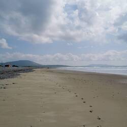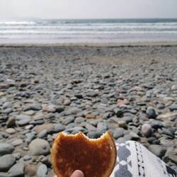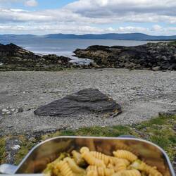Aber der Strand ist riesig und ich fand schnell ein Plätzchen für mich. Ich hatte mich zuvor in einem riesigen Supermarkt hier in Dingle (eine wirklich schöne Abwechslung zu den winzigen Stores in den Dörfern mit jeweils zwei verschiedenen Wurst und Käse zur Auswahl) mit frischen Lebensmitteln eingedeckt und bereitete mir ein Festmahl bestehend aus einem Sandwich mit geräucherter Makrele und einer Zusammenstellung verschiedener Salate vom Buffet zu, dazu gab's einen Smoothy und als Nachtisch Malteser - perfekt!