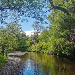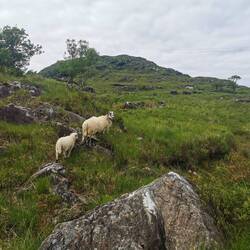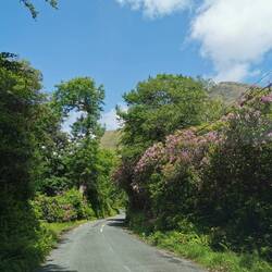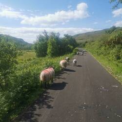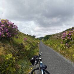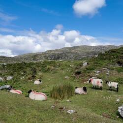 Nach der Stärkung ging es weiter, das Wetter war super und ich hatte heute nix mehr sonst geplant, als noch ein bisschen weiter Richtung Westport zu fahren, wo ich morgen eeendlich mal meine größere Radtour starten möchte. Ich entschied mich wieder für den etwas längeren, dafür aber mit wunderschöner Aussicht auf die Küste gespickten 'wild atlantic way'. Davor ging es aber erstmal noch durch den Connemara-Nationalpark und jetzt fuhr ich quasi durch genau so ein Tal, in das ich zuvor geschaut hatte. Es wechselte zwischen 'am Fluss entlang' und damit durch Felder von Farnen, durch Bögen aus Baumkronen und Rhododendron und 'über die Ebene' an Seen vorbei immer dem Weg entlang durch die Massen an Schäfchen schlängelnd, die sich von nichts aus der Ruhe bringen ließen. Die lagen da einfach am Straßenrand und hielten mit geschlossenen Augen kauend das Gesicht in die Sonne 🐑🥰. Also gelogen haben sie nicht, Connemara hat echt von allem was und ich habe jede Minute der Fahrt geliebt!!