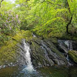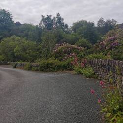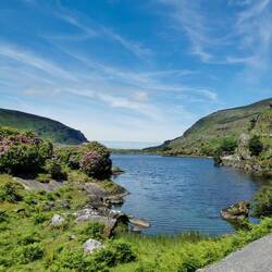 Ich genoss nur kurz den Ausblick von hier oben auf die Serpentinen unter mir, bevor ich die Beine in die Hand nahm und zügig loslief (bzw. Berg runter wurde gejoggt😅👌🏼). Also im Gegensatz zum Weg hoch der ziemlich trist war, war das hier echt ne Wucht. Ich kam an zwei Seen vorbei und wo in Irland Wasser ist, sind auch Rhododendron-Sträucher. Die pinken Büschel in der sonst sehr steinigen und tristen Landschaft, waren mal wieder eine Augenweide 😍 Ich lief flott vor mich hin und machte hier und da ein paar Fotos - soviel Zeit muss sein, dann muss ich eben schneller laufen🤷🏼♀️😋