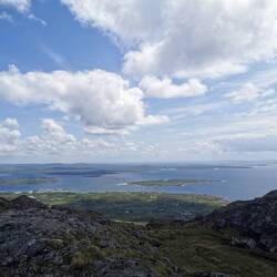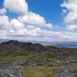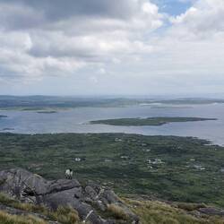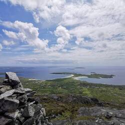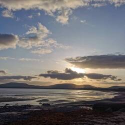 Da die Routen auf der Errisbeg nicht markiert sind, hatte ich mir Offlinekarten runtergeladen. Die Karte sagte: jetzt rechts - hmm ok, da war ein großes Metalltor, sah irgendwie eher nach Privatgelände aus. Die Aufschrift 'no dogs' auf einem Stein ermutigte mich dann aber doch, dass das wohl tatsächlich der offizielle Weg war und ich öffnete das Tor und ging über die Wiese. Dann ging es rechts hoch. Es waren schon ein paar Trampelpfade zu sehen, nur war ich mir nicht sicher, ob die tatsächlich von Menschen oder von den ganzen Schäfchen gemacht worden waren, die hier überall lagen und grasten :) naja gut, wahrscheinlich halt irgendwie da hoch. Durch die großen Felsen war der Aufstieg ziemlich simpel. Schon auf dem Weg hoch sah ich wie der Ausblick hinter mir immer beeindruckender wurde. Man hatte mal wieder das Gefühl Richtung Westen auf das absolute Ende der Welt zu schauen. Kurze Zeit später war ich auf dem ersten Gipfel angekommen. Von hier hatte man einen superschönen Blick auf die beiden sichelförmigen Strände, von denen ich gestartet war. Das Licht war genial, immer wieder wurden Teile der Landschaft von der Sonne bestrahlt während andere durch Wolken im Schatten lagen. Dadurch änderte sich ständig das Bild, der Fokus auf Details wurde immer wieder neu gestellt und man entdeckte wieder etwas anderes. Der Wind war ähnlich wie bei den Cliffs of Moher, aber ich wollte mir diese Aussicht noch ein bisschen länger ansehen. Also verschanzte ich mich hinter dem großen Steinhaufen, zog alles an was ich dabei hatte und holte mein Vesper heraus. Herrlich!