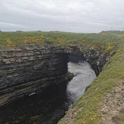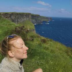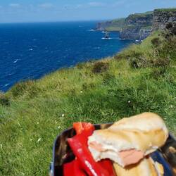Je näher ich dem O'Brians Tower kam, desto mehr Menschen kamen mir entgegen und als ich dann vorne am offiziellen Parkplatz ankam offenbarte sich das ganze Ausmaß der Tourihölle. Von hier strömte Alles gen Aussichtsplattform. Mit Kind und Hund wurde sich gegen den Wind gestemmt, der auch hier wieder echt übel war. Plötzlich bekam ich ein paar Tropfen ab. Hmm komisch, Regen war doch garnicht angesagt!? Ich schaute nach oben und sah weit und breit keine Wolke am Himmel. Na toll, also entweder hatte grad jemand in die Luft gespuckt, oder (und das nehm ich jetzt einfach mal ganz hoffnungsvoll an) es hatte jemand versucht was zu trinken und der Wind hatte seine eigenen Pläne... Wie auch immer, ich verwarf meinen Plan bis ganz zum Ende des Cliff Walks zu gehen und drehte beim O'Brians Tower um. Von dieser Seite, hatte man sowieso nur einen sehr diesigen Blick gegen die Sonne auf die Klippen, da war das von der anderen Seite schon schöner gewesen. Ich floh aus dem Gewimmel und ging ein ganzes Stück weiter, bis ich eine schöne Stelle zum Vespern fand. Ich machte es mir bequem und saugte den Blick auf die Klippen auf. Zum Glück hatte ich mich dagegen entschieden, gestern 'noch schnell' herumkommen, das hier war wirklich jede Minute wert und ich hätte mir in den Hintern gebissen, wenn ich das nur so halblebig gemacht hätte.
