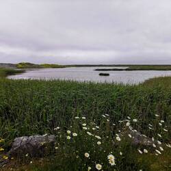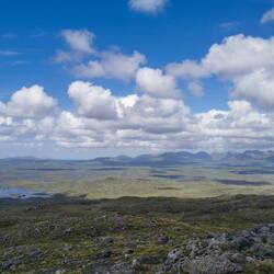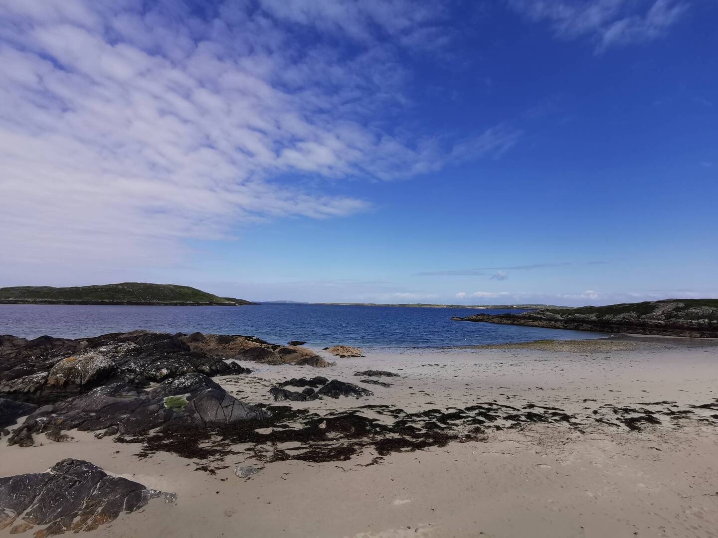 Da es echt frisch war blieb es aber bei einer kleinen Rast und es ging weiter zum Gipfel. Der war schnell erreicht und HAAAALLELUJA was war das denn!??? Ich hatte gedacht, ich hätte meine Vesperpause mit dem besten Ausblick genossen, aber das hier schoss echt jeden Vogel ab. Von hier hatte man einen 360Grad-Rundumblick und in jede der vier Himmelsrichtungen gab es einfach was anderes zu sehen. Es war als wäre jeder Bereich in ein anderes Thema eingeteilt worden: Nach Norden eine Seenplatte, wie ich sie noch nie gesehen hab - ganz flach, nur das helle Grün der Wiesen und dann hunderte von kleinen Seen, die wie Tupfen dunkelblau darauf gesetzt waren. Nach Osten Berge, ebenfalls grün überzogen, was mich irgendwie an diese flauschig-stupfigen Eisenbahnwelten erinnert hat. Nach Süden die Strände, eine Bucht reihte sich an die nächste mit strahlend weißem Sand und türkisfarbenen Meer. Und nach Westen der ewig weite Ozean, der in dem disigen Licht optisch mit dem Horizont verschmolz. Dazu noch das wechselnde Licht und die vielen Wolken, die aussahen als wären sie einfach in den blauen Himmel geworfen worden (ich weiß, klingt alles irgendwie bissl kitschig und übertrieben, aber da war einfach so viel los, ich hab sowas noch nie gesehen!!!). Ich weiß nicht wie oft ich mich im Kreis gedreht hab um zu versuchen, das alles aufnehmen zu können. Ich war so baff und konnte nur stehen und glotzen. Der Wind war so heftig und kalt, ich spürte meine Hände schon garnicht mehr, meine Nase lief ununterbrochen und meine Augen tränten (offiziell natürlich alles vom Wind, aber ich gebe zu, da haben mich schon auch kurz die Emotionen gepackt - wie kann ein Ort so schön sein bitte und einfach ALLES zusammen in einer Landschaft vereinen!!? 🥹) Ich stand gefühlt ne Ewigkeit da, weil ich mich einfach nicht losreißen konnte, aber irgendwann war ich so durchgefroren, dass es nicht mehr ging. Als ich mich an den Abstieg machte, war mein Kopf ganz leer. Ich hatte gedacht das würde ne ganz süße kleine Wanderung werden, mit SOWAS hatte ich einfach überhaupt nicht gerechnet. Ich ging noch zu dem anderen der zwei Strände, setzte mich auf einen Felsen und versuchte mich ein bisschen zu sammeln, bevor ich wieder rüber zum Auto ging.