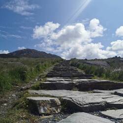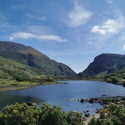 Neuer Tag, neue Wanderung. Heute ging es in den Connemara-Nationalpark ein Stückchen weiter oben im Norden. Ich freute mich, die Beschreibung der Gegend lautet 'Eine Mischung aus kanadischen Wäldern und schwedischer Seenlandschaft'. Der Weg dort hin allein lohnte schon, denn es ging wieder bei gutem Wetter auf schmalen, blumenverzierten Wegen am Wasser entlang. Dort angekommen stellte ich schnell fest, dass das hier kein Geheimtipp war (zumindest nicht die Wanderung die ich rausgesucht hatte). Der Parkplatz war schon gut besucht... Ich ging kurz am Besucherzentrum vorbei und startete dann direkt zum Upper Diamond Hill Walk, der bis auf die Spitze des gleichnamigen Berges führte. Erst ging es ganz entspannt über Holzpanele durchs Moor, dann steil über große Felsstufen in Serpentinen nach oben bis zum Gipfel (erinnerte mich irgendwie an die Wanderung auf den Reinebringen in Norwegen am Ende meiner Skandinavienreise damals, hier waren es auch solche Stufen gewesen). Von hier hatte man einen tollen Blick auf die Inselgruppe vor dem Festland und den ganzen Küstenabschnitt. Sehr schön, aber an den gigantischen Ausblick von gestern kam es nicht ran. Die Route führte hinter dem Gipfel runter und um den Diamond Hill herum zurück. Der Blick hier hinten ins Tal fesselte mich im Gegensatz zu dem nach vorne deutlich mehr. Man sah in ein grünes Tal, das so unberührt aussah dass es fast unecht wirkte. Es war durchzogen mit Flussläufen und im Gegensatz zu dem grünen Pelz der die Hügel überzog und sie ein bisschen karg und gleichzeitig so saftig wirken ließ, waren die Flussläufe über und über voll mit den pinken Blüten vom Rhododendron. Also auf diese Farbkonstellationen komm ich einfach nicht klar, das ist sooo schön!