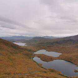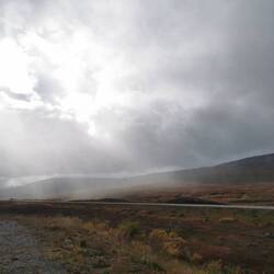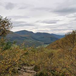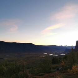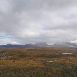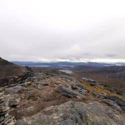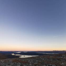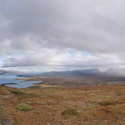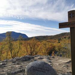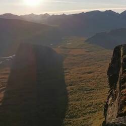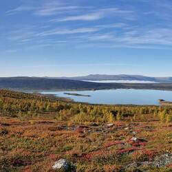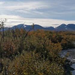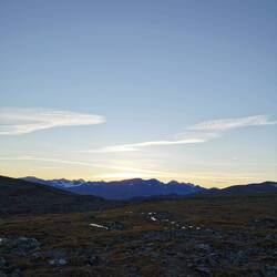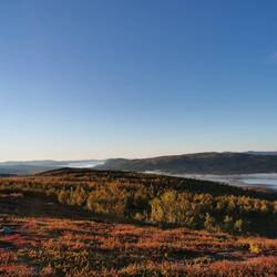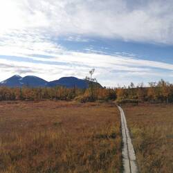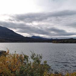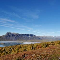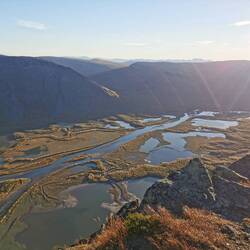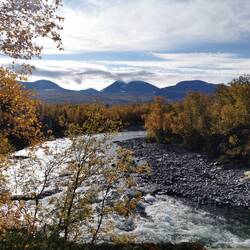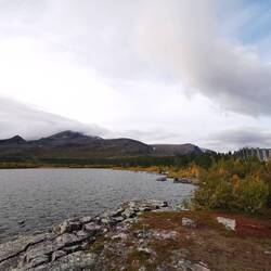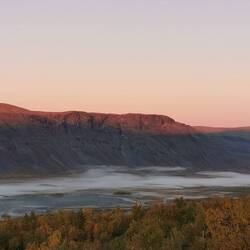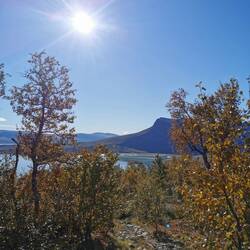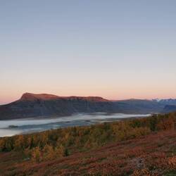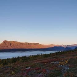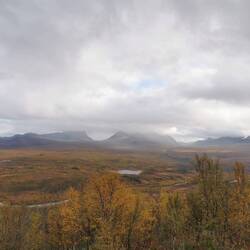 Es ging 20 min nach oben - von hier hatte man einen wahnsinns Blick über den See Torneträsk und das Abisko-Panorama. Rechts die Bergkette hing in dichten Wolken und Nebel, links wurden die Gipfel und der See angeleuchtet und unten sah man die Straße, wie sie sich durch den orange-gelb gefärbten Wald schlängelt, den Abisko-Canon und wie der See hineinmündet und den Fluss Abiskojokka. Wie riesig dieses Gebiet einfach ist und diese massiven Bergketten um den See - von hier oben wurde schnell klar woher die Faszination für diese Gegend kommt die jedes Jahr so viele Abenteurer anlockt!