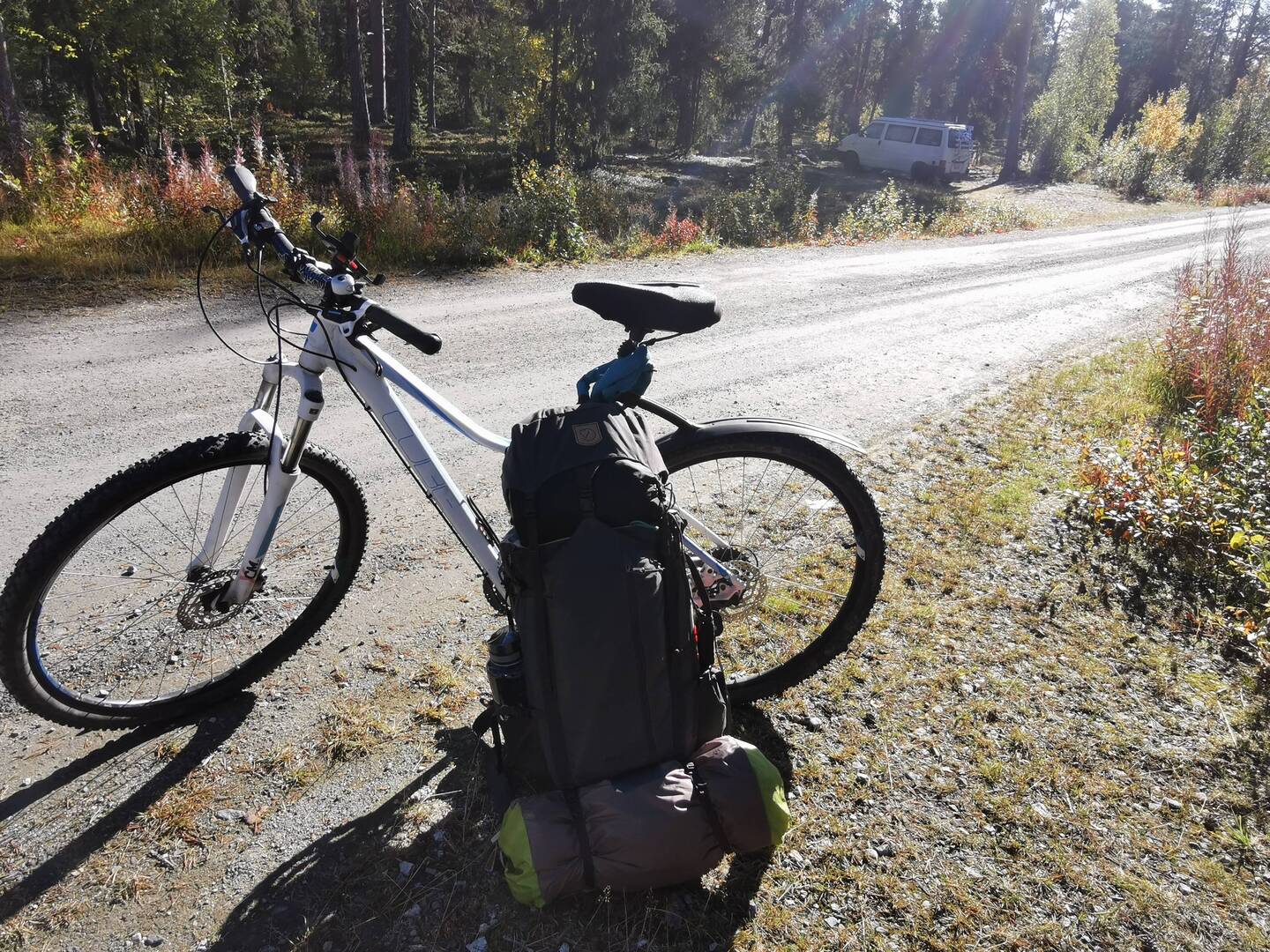 Ich brauchte ein bisschen bis ich in den Tag starten konnte - die Nacht war ja dann doch wieder etwas kürzer gewesen durch das Feuerwerk am Himmel🌌🥰 Bereits um 8 Uhr hörte ich die ersten die vom Parkplatz starteten - ich hatte beschlossen den ersten Abschnitt mit dem Rad zu machen und hatte dadurch etwas mehr Zeit. In der Hauptsaison kann man nach diesem Abschnitt einen Shuttle per Boot nehmen, das heißt 10km laufen bis zum Bootsanleger und dann 6km mit dem Boot bis nach Aktse zur Wanderhütte Aktseprehytta von der es dann nochmal 8km auf den Berg bis zum Aussichtspunkt sind. Leider erklärte mir die Dame gestern am Telefon, dass das aktuell nicht ginge, weil Nebensaison und neben ihrem Hotelbetrieb gerade zu wenig Zeit sei. 16km zu Fuß allein bis zur Hütte + dann nochmal hoch zum Gipfel hatte ich keine Lust (ich hatte ja zuvor schon schmerzlich die Erfahrung gemacht, dass so eine Strecke absolut kein Klaks ist... 🙈) - also 10km mit dem Rad und dann den Rest zu Fuß... Diese ersten 10km waren dann aber kurz schon etwas gewöhnungsbedürftig - mit dem riesen Rucksack mit Zelt und allem angeschnallt musste ich mich kurz umstellen was die Balance angeht, dann noch die klobigen Wanderschuhe dazu - hat sicher interessant ausgesehen😅👌🏼 Zudem war der Weg mehr Mondlandschaft als Weg und man musste großen Schlaglöchern und spitzen Steinen ausweichen. Mein armes Fahrrad quitschte und ächtste unter mir und teilweise fühlte es sich echt so an, als würde es unter dem Gewicht richtig zusammengedrückt. Fingers crossed, dass die Räder keine Luft lassen bis ich zurück komme 😬🤞🏼🤞🏼🤞🏼