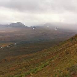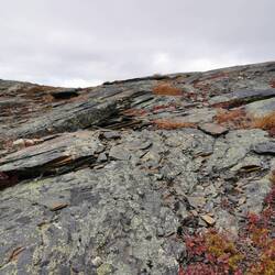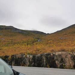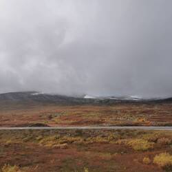 Als ich aufwachte sah ich überhaupt erstmal, wo ich in der Nacht zuvor gelandet war. Ich war auf einer Hochebene des Dovrefjell-Sunndalsfjella NP. Jetzt machte es auch Sinn, dass es in der Nacht ordentlich kalt um die Nase gewesen war - ich war umringt von Nichts als karger Landschaft und in der Ferne waren wieder schneebedeckte Berge zu sehen. Nachdem ich also die letzten Tage mehr durch grüne Landschaften gefahren war, war hier wieder das Herbstrot am Start.