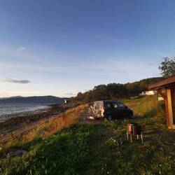 Rolf - der Betreiber - kam auch gleich, zeigte mir alles, klopfte mir auf die Schulter und wünschte mir einen schönen Aufenthalt. Hier stehe ich jetzt am Solbergfjord, habe einen wunderschönen Blick aufs Meer und meinen eigenen kleinen Unterstand wo die Wäsche hängt und hoffentlich bis morgen trocken wird 🤞🏼🤗Read more