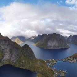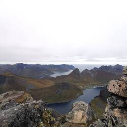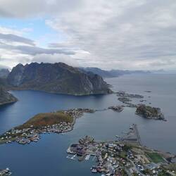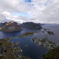 Nach etwas mehr als einer Stunde Treppentraining war ich oben und freute mich über einen schönen Blick über Reine mit den Brücken die die einzelnen Inseln verbinden und den vielen bunten Holzhäusern. Von hier ging auch noch ein Trampelpfad weiter der über einen Hochgrat bis vor zur Spitze des Reinebringen führt. Da doch ein paar Leute unterwegs waren und ich heute nicht gewillt war es mir nochmal voll zu geben, reichte mir der Ausblick von hier unten und nach einer Weile gucken drehte ich rum und ging wieder runter.