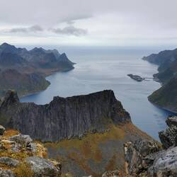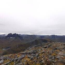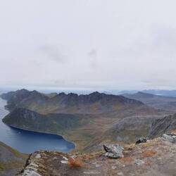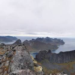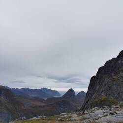 Ich ging links und schleppte mich Meter für Meter nach oben. Schon an der Gabelung war der Blick auf den Fjord freigeworden und fantastisch gewesen, oben angekommen erwartete mich aber dann ein echter Knallerblick. Jap das entschädigte definitiv für den Aufstieg. Es war bewölkt, trotzdem konnte man von hier oben ewig weit sehen und diese vielen zackenförmigen Gipfel um mich herum sahen einfach nur unreal aus. Dieses Land mit seiner landschaftlichen Rohheit und Rauheit haut mich einfach immer wieder um!!