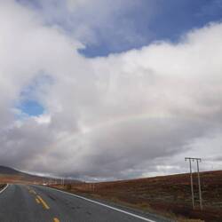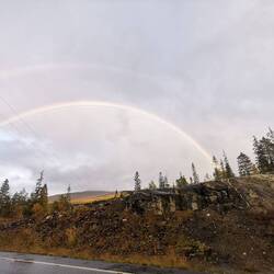 Es ging durch Berge, über Hochebenen, teilweise sah die Landschaft aus wie bei uns im Allgäu mit saftigen hellgrünen Wiesen, teilweise wie eine Mondlandschaft mit nichts als kargem Stein und schneebedeckten Bergen. Hier und da fuhr ich an Fjordarmen vorbei, immer wieder Wasserfälle, Flüssen und gaaaaanz viel Wald. Im einen Moment fuhr man durch Regen in einen Tunnel, im nächsten Moment verließ man den Tunnel bei strahlendem Sonnenschein und hinter einem bildete sich ein Regenbogen am Himmel. Diese Landschaft ist so vielseitig und außergewöhnlich und wenn man stundenlang so fährt denkt man teilweise das Land ist unendlich.