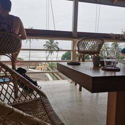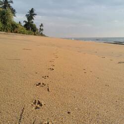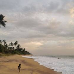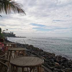 Lulu und ich liefen den gewohnten Weg bis vor zum Strand und sahen schnell, dass der Strand um diese Uhrzeit noch garnicht existiert. Hmm schade, eigentlich wollten wir den langen Sandstrand ablaufen, uns noch ein bisschen umsehen für potentielle Badestellen und wie gesagt die Angler ein bisschen beobachten. Da wir nicht vorne am Wasser laufen konnten, liefen wir eben vorne an der Straße an den Läden vorbei. Bei jeder Abbiegung zum Strand schauten wir, wie es vorne aussah, leider jedes Mal mit dem Ergebnis: kein Strand zum laufen, keine Angler. Mist, wahrscheinlich war hier Sonntags auch Ruhetag und keiner setzte sich auf die Pfähle, die Holzauslagen vor den Strandabschnitten wo sonst der Fisch ausliegt und sich die Leute tummeln, waren auf jeden Fall auch leer. Tja da denkt man die Sri Lanker hätten keine Regeln und jeden Tag würde das immergleiche Chaos herrschen - Pustekuchen, erst der Feiertag und jetzt wird hier auch noch Sonntagsruhe gehalten, das hatten wir echt nicht erwartet 😅🙈 Wir liefen noch ein ganzes Stück, um uns wirklich zu vergewissern, dass heute nix los war und kamen an einen breiteren Strandabschnitt. Hier war es wirklich schön und wir konnten noch ein Stück am Wasser laufen :) Als wir auch noch ums letzte Eck geschaut hatten und nix entdeckten, drehten wir um und machten uns auf den Rückweg. Wir hatten uns zum Frühstück mit Sara verabredet, bis dahin war es aber noch eine Stunde und wir hatten beim Herlaufen ein paar süße Cafés direkt am Wasser gesehen, also beschlossen wir uns noch ein Getränk und ein bisschen schönen Ausblick zu gönnen. So am Meer zu wohnen muss einfach toll sein, ich könnte stundenlang einfach in die Wellen schauen und den Kopf vom Wind freipusten ❤️
