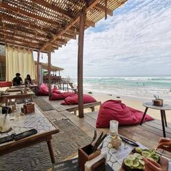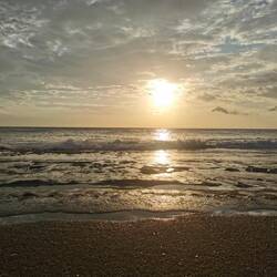 Da die Situation mit dem Schatten an diesen Stränden nicht ganz so einfach ist, beschlossen wir heute nochmal unseren tollen Pool in der Unterkunft zu genießen. Vorher wollten wir aber noch ein paar letzte Souvenirs ergattern, also gings nochmal die Straße hoch und runter und dann zurück. Dort wurde nochmal ordentlich entspannt und gefaulenzt. Zum frühen Abend gings dann wieder vor zu den Restaurants. Diesmal versuchten wir das Mermaid's Kitchen und wieder saßen wir wunderschön vorne auf der Terasse mit Blick auf die Wellen. Das Wetter hatte gut über den Tag gehalten, jetzt zog es aber ganzschön zu. Trotzdem bekamen wir endlich einen schönen Sonnenuntergang. Die Sonne ging tiefrot unter und die Kulisse dazu war einfach genial! Dazu schmeckte das Essen noch gut und wir waren im Glück. Gerade als wir beschlossen hatten, jetzt wäre doch ein guter Zeitpunkt zur nächsten Eisdiele zu laufen für einen kleinen Nachtisch, fing es an zu blitzen und kurz darauf folgte ein kleiner aber heftiger Schauer. Froh darüber, dass wir einen Platz unter dem Dach hatten, harrten wir auf unseren Kissen aus, nur um wenige Minuten später festzustellen, dass das Dach wohl schon einige Risse hatte und das Wasser jetzt eben so auf uns runtertropfte 😅🙈 Die Bediensteten rannten hin und her, packten eifrig alles ins Trockene und nebenher wurde fleißig weiterbedient und Bestellungen aufgenommen, das geht hier alles ganz easy nebenher, sind ja immer mehr als genug Leute da 👍🏼😃