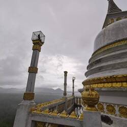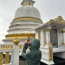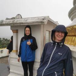 Es wurde weniger (zumindest für kurz), also machten wir uns auf und kamen dann 10 min später bei strömendem Regen an. Gut dass das ein Barfuß-Hike war, das hätten auch meine wasserdichten Schuhe nicht gepackt. Man hörte schon den Gesang vom Tempel (kein echter Gesang, eher eine wummernde Dauerschallplatte). Wir wurden angehalten ohne zu sprechen hinaufzulaufen und nach ein paar Abzweigungen und etlichen Treppenstufen waren wir oben angekommen. Der Ausblick war durch den Regen etwas getrübt, trotzdem war es cool über den Dschungel und die Seen schauen zu können.