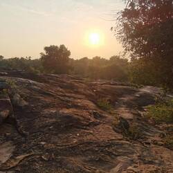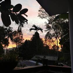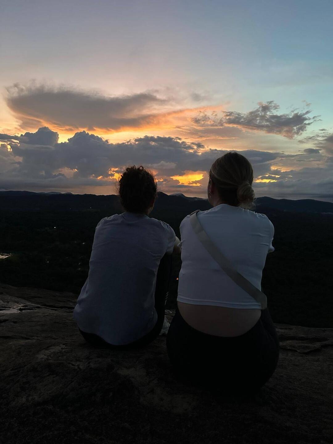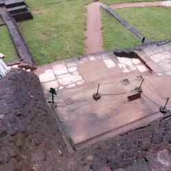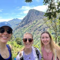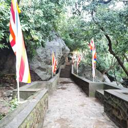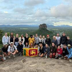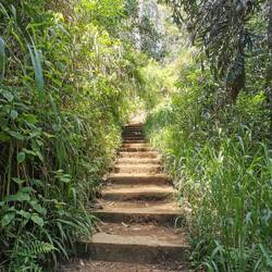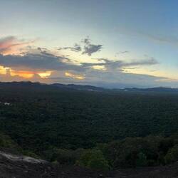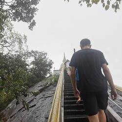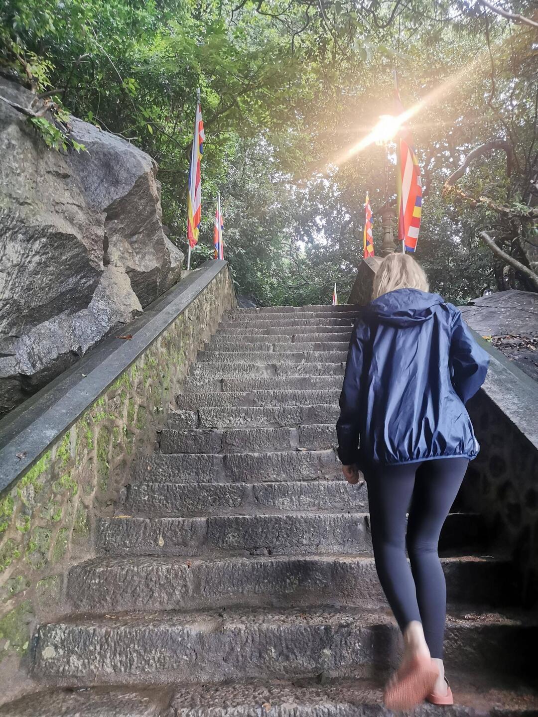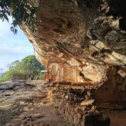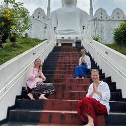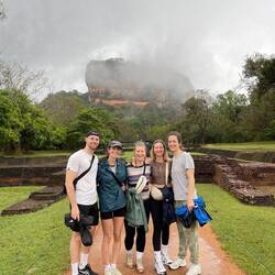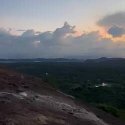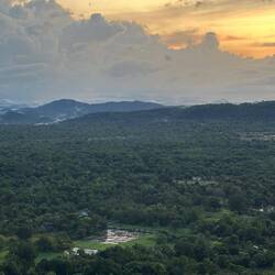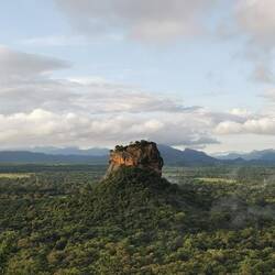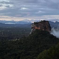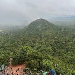 Nach kurzer Fahrt im stickigen Jeep waren wir am Eingang angekommen und schon liefen wir los, ein paar Treppen an einer kleinen Gedänkstätte vorbei. Danach ging es dann zwar weiterhin über Stufen, nur waren die sehr unterschiedlich hoch, durch den vielen Regen die letzten Tage rutschig und in der Dunkelheit schlecht zu sehen. Das Herausfordernste für mich war es aber einfach, um kurz nach 5 in der Nacht von 0 auf 100 sonen Berg hochzustiefeln. Es brauchte nur wenige Minuten und alle waren am schnaufen und keuchen. Die Stufen waren anstrengend, doch danach gings erst richtig ans Eingemachte - über Stock und Fels ging es immer weiter nach oben. Zwischenzeitlich musste man sich an einem Seil am Felsen hochziehen und am Ende nochmal ordentlich durch einen Engpass klettern bis wir schlussendlich oben waren auf dem heiligen Pidurangala-Rock. Es wehte ein angenehmer Wind. Wir liefen ein ganzes Stück auf dem Felsen nach hinten, um einen schönen Blick auf die aufgehende Sonne zu haben. Hier blieben wir eine Weile, bis der ganze Dschungel um uns rum in einem diesigen Licht erschien. Auf der anderen Seite wurde nun mehr und mehr auch der Lion's Rock sichtbar, auf den wir vorgestern Abend gestiegen waren. Dieses berühmte Bild vom Felsen der im Unesco-Welkulturerbe steht, selber sehen zu können, war schon ein richtig cooles Gefühl. Unten erwachte der Dschungel immer mehr zum Leben, man hörte die vielen Vögel und auch die Pfauen, die hier so reichlich vertreten sind, ließen wieder ihre typischen Miau-Rufe ertönen. Wir sahen zu bis der Lion's Rock vollständig im Licht lag und machten (wie alle anderen die so früh den Aufstieg gewagt hatten) Bilder von der Landschaft und von uns und dem Felsen. Vor dem Abstieg gab's dann noch ein Gruppenfoto mit der ganzen Hostel-Gruppe und jeder durfte mal die Flagge von Sri Lanka halten. Der Abstieg war fast noch beschwerlicher wie der Aufstieg. Zum einen wollten auf einen Schlag ALLE wieder runter, zum anderen kamen gleichzeitig auch immernoch Leute von unten hoch. Dass manche dann auch noch mit Flip-flops und Sandalen unterwegs waren auf den rutschigen Felsen, machte die Sache nicht unbedingt besser... Letztendlich schaffte es unsere Gruppe bis auf ein paar blaue Flecken unversehrt wieder nach unten 👌🏼