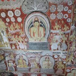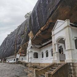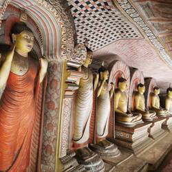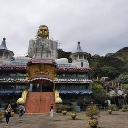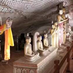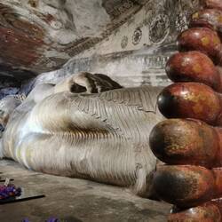 Um 11 Uhr war der Ausflug zu den Cave-Tempeln von Dambulla geplant. Wir schafften es gerade noch so rechtzeitig zum Frühstück bevor es losging, die Nacht hatte uns echt zugesetzt. Eine halbe Stunde später waren wir am Eingang des Tempels. Wir kauften die Tickets und dann ging es erstmal einige Treppen hoch. Oben angekommen mussten wir die Schuhe abgeben, um barfuß die heiligen Stätten betreten zu können. Der Tempel war unter und in den Fels gebaut worden, außen ganz in weiß uns in den Höhlen ganz farbenfroh und bunt mit Naturfarben bemalt. Es war beeindruckend wie dort eine Buddhastatue neben der nächsten saß. Mir hatten es aber vor allem die Decken angetan - jeder Centimeter war bemalt, es reihte sich ein Symbol ans nächste, das sah echt fantastisch aus!