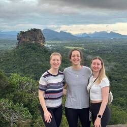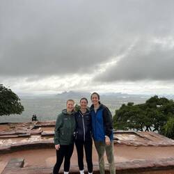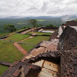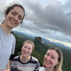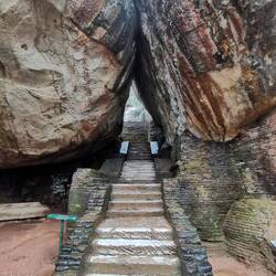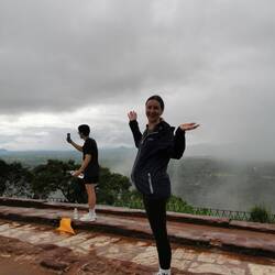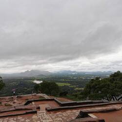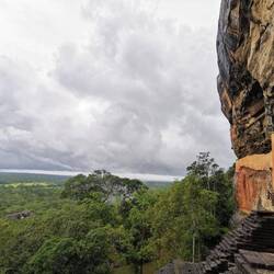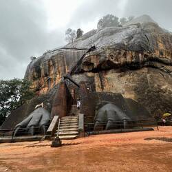 Wieder zurück am Hostel entschieden wir uns einen kleinen Nap zu machen bevor es abends dann zum Sunset-Hike auf den Lion's Rock gehen sollte. Ursprünglich war hier 16.30 Uhr als Abfahrt festgelegt worden. Als ich um 16.20 Uhr vorne nachfragte schaute man mich aber nur verdutzt an und meinte "Ja Abfahrt war um 4...Wir können aber noch gehen...". Ahhh was war denn aus der 'Sri Lanken-Time' geworden? Normalerweise ging es hier doch eher ein paar Minuten später los als früher!?!?! Naja gut, also schnell zurück und die anderen geweckt. Wenige Minuten später waren wir vorne und pferchten uns in den Truck. Ein deutsches Pärchen, das es genauso wie wir verstanden hatte kam auch noch mit und so waren wir eine süße Gruppe von 5 Leuten. Vor Ort wurde uns noch ein Guide organisiert und schon ging es los. Rock war gut gelaunt, da wir aber etwas später losgegangen waren und er uns noch die Wandmalereien zeigen wollten bevor dieser Abschnitt der Wanderung geschlossen wurde, hatte er ein ganzschönes Tempo drauf 😅🙈 Es ging die ersten 500 von insgesamt 1200 Stufen hinauf, immer mit kurzen Zwischenstopps und Erklärungen zu dem was wir da so sahen. Der Ausblick von oben war hier schon beeindruckend. Die Wandmalereien handelten von den 500 Frauen, die der König um sich schaarte und die wohl den ganzen Tag in den unteren Pools plantschten zur Freude des Königs - die Schönsten von ihnen wurden hier oben am Fels verewigt, vollbusig und behangen mit edlem Schmuck. Früher waren die Mönche diesen Abschnitt an Bambusleitern hochgeklettert (das kann man sich echt kaum vorstellen, der Fels ist so glatt und steil🤯), wir konnten glücklicherweise die Wendeltreppe nehmen. Dann ging es weiter zum Eingang des Lion Rocks. Durch einen nachempfundenen Löwenschlund liefen wir die letzten Abschnitte über Metallstufen nach oben - Rock in seinen pinken Crocs vorne weg, wir hinterher. Oben angekommen wurden wir durch die Ruinen des Königs geführt und da wir durch die Wolken und den Regen trotzdem auch ein bisschen Aussicht hatten, genossen wir den Blick und schossen ein paar Fotos.