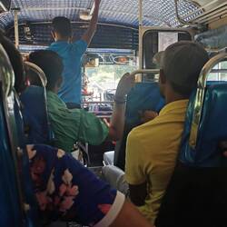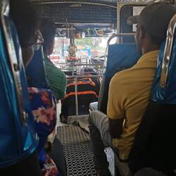 Der Bus hielt gefühlt an jeder Ecke und es stiegen jedes Mal deutlich mehr Leute ein als aus. Alle quetschten sich an unserem Nachwuchs-Superstar vorbei, der ließ sich davon aber keinesfalls beirren und sang ohne Emotionen zu zeigen weiter. Nach ein paar Stationen hatte er seinen Auftritt beendet. Er wurde von den Fahrgästen mit kleinem Geld für seine Darbietung entlohnt, sein Abgang wurde weiterhin durch drönende Musik aus seinem Lautsprecher begleitet.