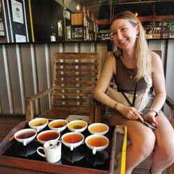 Nr. 1 war eine Teefabrik. Wir wurden über die verschiedenen Sorten aufgeklärt und durften die Fabrik und die Maschinen anschauen. Das Interessante hier ist, dass schwarzer und auch grüner Tee aus ein und derselben Pflanze hergestellt werden, nur die Zubereitung ist eine andere. Beim schwarzen Tee werden die Blätter gehackt, anschließend zur Oxidation ausgelegt und dann durch Hitze getrocknet. Beim grünen Tee lässt man die Blätter ganz. Sie werden mit Dampf erhitzt/gedämpft und anschließend getrocknet. Der edelste Tee aus dieser Rubrik ist aber der weiße und der goldene Tee. Sie werden nur aus den Babyblättern die sich noch garnicht entfaltet haben gewonnen und ist dadurch noch reicher an Antioxidantien und all den anderen tollen Sachen. Diesen Tee verwenden die Sri Lanker mehr wie einen Energy-Shot oder Medizin und da er so besonders und selten ist, wird er nicht international verkauft (toll, das gute Zeug behalten sie also für sich 🤷🏼♀️). Wir wurden aus der Fabrik und nach oben in den Verkaufsraum geführt und durfen nun alle Sorten die uns zuvor vorgestellt wurden probieren. Der Royal Tea (ein mittelstarker Schwarztee) und der White Tea schmeckte uns allen am besten. Da man den White Tea nur sehr teuer online erhält, wollten wir davon etwas mitnehmen. Fast hätten wir uns verrechnet und ein kleines Vermögen für 100g ausgegeben, nach kurzer Überlegung wurden es dann für jede die 50g - mit knapp 30€ immernoch ziemlich ordentlich... 🙈
