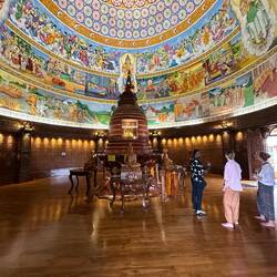 Unsere kleine Shoppingeskalation war zu Ende, nun standen noch die Religion und Kultur auf der Liste. Für den Punkt Religion ging es zu einem großen Tempel. Roshan kaufte ein paar Blumen und Räucherstäbchen und zeigte uns wie man das hier machte. Er erzählte uns die Geschichte von Buddha, wie er erst Schlechtes tat und dann durch seine Frau wachgerüttelt wurde und sich nach 15 Jahren der Meditation im Wald um 180°drehte. Er erklärte uns alles mit einer solchen Leidenschaft, dass man merkte wie sehr er die Lebensart des Buddhismus liebt und lebt. Am Ende fasste Roshan den Buddhismus in 4 Worten (eher Glaubenssätzen) zusammen. Diese 4 Worte sagt jeder Buddhist 2x am Tag zu bestimmten Uhrzeiten vor sich auf, um sich daran zu erinnern und Buddha zu danken.