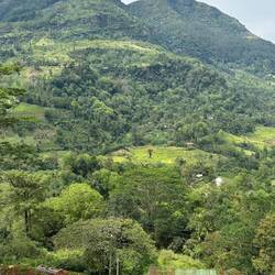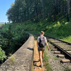 Unser letzter Tag in Ella stand an. Dieses Städtchen hat schon wirklich was, trotzdem dass es etwas überlaufen von den Touris ist. Es war schön einfach mal Bummeln zu gehen und sich in den Restaurants was Leckeres zu gönnen. Heute wollten wir nochmal eine Wanderung machen, um noch etwas mehr von der Landschaft zu sehen, bevor es dann morgen weiter geht Richtung Yala Nationalpark. Wir holten unten am Rotti-Stand drei von den leckeren Teigfladen und stiefelten los zum Bahnhof. Von hier ging es immer auf oder an den Schienen entlang bis vor zur 9Arches-Bridge. Hier war heute ganzschön was los und wieder waren wir zufälligerweise zu der Zeit da, als der Zug einfuhr. Wir warteten bis der Zug wieder weg fuhr und sich das Getümmel etwas auflöste. Dann gingen wir über die Brücke, schossen von der anderen Seite noch ein paar Bilder und folgten dem Weg der Schienen noch ein Stück weiter. Es ging seitlich (mal wieder) über Stufen nach oben in eine Häusergruppe. Oben angekommen waren wir endlich alleine, jetzt konnten wir ungestört die Natur genießen. Pahhh haste gedacht... Hinter uns hörten wir laute Musik, die immer näher kam. Ein Auto mit 2 riesen Megaphonen auf dem Dach kam angefahren. Wir quetschen uns auf die Seite und ließen es vorbeifahren. Kurz stoppte die Musik, dafür wurde zum Gruß gehupt, gegrinst und gewunken, dann wurde wieder voll aufgedreht gefolgt von Durchsagen. Ist das hier die Radioversorgung für die Bergbewohner oder kann man das ein Hobby nennen? Wie aus Vielem hier wurden wir auch daraus nicht so ganz schlau. Sie waren aber bald weitergefahren und es war wieder nur das Vogelgezwitscher zu hören. Der Weg führte wunderschön durch die Berge, vorbei an Reisfeldern und den ewig weiten Teeplantagen. Daran kann ich mich kaum sattsehen 🥰 Wir waren auf dem ganzen Weg für uns, nur ein paar Teepflückerinnen und schüchterne Plantagenarbeiter grüßten uns aus der Ferne :)