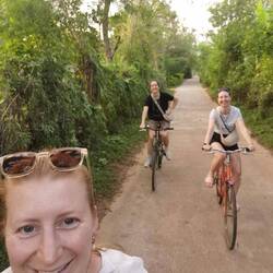 Es wurde langsam richtig dunkel und wir hatten keine Lichter an den Rädern (nicht dass sich hier irgendjemand daran stören könnte, aber da der Verkehr ja schon bei Licht wild sein konnte, wollten wir es nicht noch mehr herausfordern), deshalb war es Zeit zurückzufahren. Auf dem Weg ging es durch Schwärme an Mücken und wieder vorbei an schlafenden Hunden, Kühen die in aller Seelenruhe im Pulk auf der Straße standen und vielen Menschen, die uns grinsend zuriefen oder wunken. Die sind aber auch alle goldig hier :)