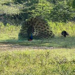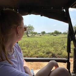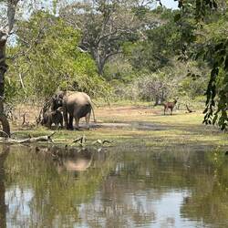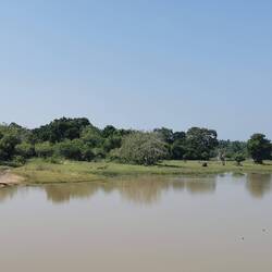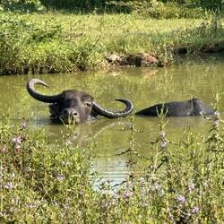Als die Tore geöffnet wurden, gab's kein Halten mehr, die Jeeps rasten los und überholten sich immer wieder auf der von Schlaglöchern zerfurchten Staubstraße - die Leopardenjagd war eröffnet. Schon bei der ersten Safari in Sigiriya wurden wir ordentlich durchgerüttelt, aber das war nochmal ne Schippe drauf. Damid nahm eine andere Route wie die anderen Fahrer. Die war ursprünglich gesperrt gewesen, da es vor ein paar Tagen heftig geregnet und alles überschwemmt hatte, doch hier macht ja jede/r seine eigenen Regeln, deshalb gings an der Absperrung vorbei und teilweise durch knietiefes Wasser immer weiter. Bereits nach ein paar Minuten schrie Damid "Leopard, Leopard!!!" und raste los - und tatsächlich sahen wir wie ein Leopard federnd im Gebüsch verschwand (bzw. Lulu und ich sahen es wohl, Sara sah nur noch den Schwanz und die Jungs schliefen noch zu sehr, um auch nur irgendwas zu sehen). Damid war ganz außer sich vor Aufregung und fragte ständig 'Did you see it??' - er konnte nicht fassen, dass er diese Sekunde in seinem Verzeichnis als erfolgreich gesichteten Leopard verbuchen konnte. Als er sich wieder gesammelt hatte fuhren wir weiter. Wir sahen einen Elefant, getupfte Rehe und Antilopen, Krokodile, Adler, Papageien und viele kleinere und größere kunterbunte Vögel, dann noch Mangusten, Echsen und viele badende Büffel die aussahen als würden sie ihren Spa-Day richtig genießen.