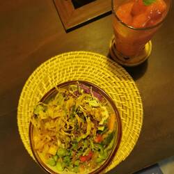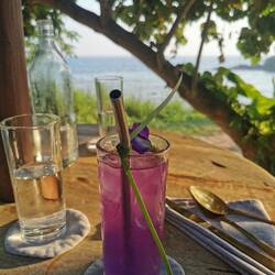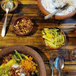 Langsam bekamen wir ein Hüngerchen und bestellten das hausgemachte Curry mit Reis. Nach kurzer Zeit wurden mehrere Schüsseln mit Bohnen, Jackfruit, Kochbananen und noch anderen Köstlichkeiten aufgetischt, dazu noch ein frischer Wassermelonensaft, geht's noch besser???!? Alles war so lecker, nur die Schärfe (obwohl wir in weiser Voraussicht extra "mild" bestellt hatten) trieb mir leicht die Tränen in die Augen😅😅👌🏼 Na da schauen wir mal wie mein Körper das so verpackt 🙈🤷🏼♀️😅