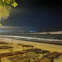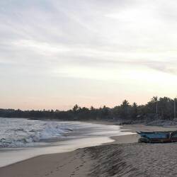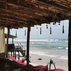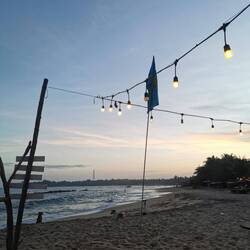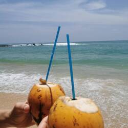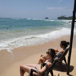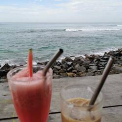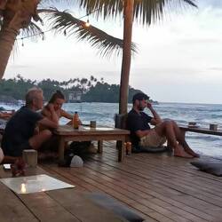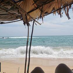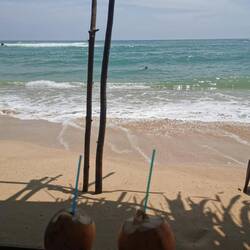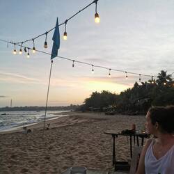 Die Portionen waren sehr reichlich und wir aßen bis wir fast platzten. Es war zwar immernoch brutal warm draußen, aber jetzt mussten wir ein bisschen laufen, um den Bauch zu bewegen. Wir liefen ein Stück nach vorne, wo der größere Strandabschnitt beginnt und sich mehrere Restaurants und Läden aneinander reihen. Die Läden hatten noch geöffnet und wir schauten in den ein oder anderen rein, fanden aber nix und beschlossen, morgen bei Helligkeit nochmal wiederzukommen. Es war noch recht früh, deshalb beschlossen wir noch spontan was trinken zu gehen. Vorher waren wir schon an einem Laden mit lauter Musik vorbeigekommen, vielleicht war das ja was. Der Laden war rappelvoll - kein Wunder, die Terrasse war bis vor zum Strand gebaut worden und der Ausblick auf die Wellen war einfach hammer! Wir bestellten eine Runde Cocktails und ergatterten dann doch noch einen Platz an den großen Holzstufen zum Meer. Schade, dass wir nicht noch ein paar Tage haben, um das Meer noch richtig zu genießen. Morgen ist schon der letzte Tag hier bevors nach Colombo geht... Also nochmal alles aufsaugen :)Læs mere