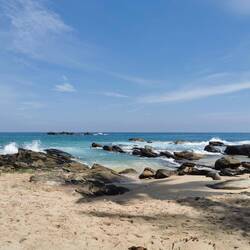 Da der Regen in dem Moment tatsächlich aufhörte, liefen wir schnell hoch zur Unterkunft, schnappte unsere Strandtaschen und los gings zum Goyambokka Beach. Auch wenn es noch bewölkt und für später auch noch Regen angesagt war, Hauptsache kurz am Strand die Füße ins Wasser strecken und die Wellen hören, mehr wollten wir garnicht. Als wir unten am Strand ankamen konnten wir unser Glück garnicht fassen - die Sonne kam raus☀️🤩🤗