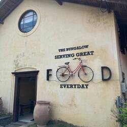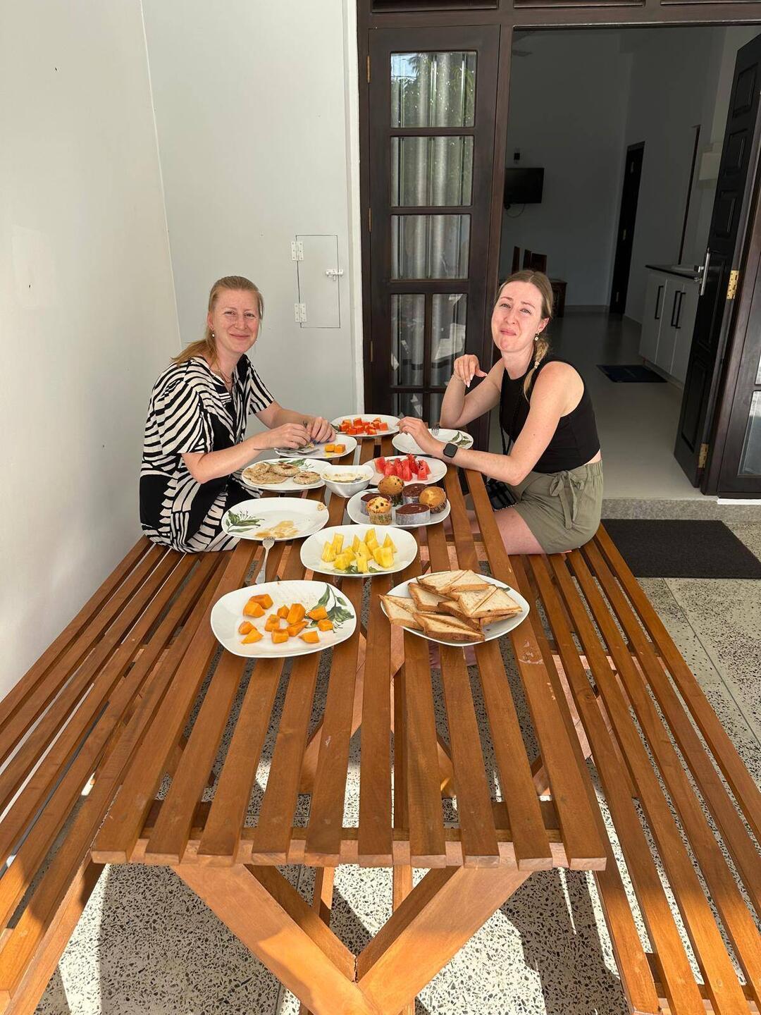 Wir liefen zurück und gegenüber in ein kleines Sträßchen, das mehr oder weniger zu einem kleinen Pfad durch die Häuser wurde. Wir landeten in einem Hof - auf dem Schild stand zwar der Name des Restaurants, die Dame die kleine Blüten von einem Strauch pflückte schaute uns aber so skeptisch an, dass wir uns nicht wirklich sicher waren, ob wir hier die richtige Einfahrt genommen hatten. Naja schaun wir mal... Wir liefen ein Stück weiter in den Hof und entdeckten einen Steinweg nach hinten in den Garten. Und tatsächlich, es tat sich ein Sitzbereich auf mit mehreren Tischen und Stühlen und jetzt wurden wir auch freundlich begrüßt und an einen Platz gebracht. Noch bevor wir uns setzten machten sich die Mosquitos über uns her, doch der nette Mann brachte uns gleich Mückenspray und stellte Spiralen auf. Die Menükarte war ziemlich mau, im Prinzip gab's nur Curry 😃 War aber Wurst, denn genau deshalb waren wir ja da. Und das waaaaaar mal ein Curry! Nur kurze Zeit nachdem wir bestellt hatten kam auch schon eine nette Frau mit einem Tablett voller Schalen voll mit Köstlichkeiten - Karotte, Kartoffel, Ananas, Bohnen, Aubergine, Zwiebeln... es hörte garnicht mehr auf. Und dann war das alles auch noch so unfassbar lecker (die eingelegte Ananas trieb mir nur mal wieder die Tränen in die Augen vor Schärfe, trotzdem dass die Köchin ganz überzeugend gesagt hatte "no spicy madame, no spicy!" - jaja das Sri Lankische 'no spicy' kenne ich mittlerweile 😅👌🏼), wir waren uns einig, das war wirklich eins der besten Currys, die wir bis jetzt auf der Reise gegessen hatten🤩👌🏼🤤