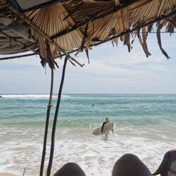 Es war früher Mittag und wir beschlossen zurück zu fahren nach Weligama und den restlichen Tag gemütlich am Strand zu verbringen. Nach einer Weile fanden wir tatsächlich ein schattiges Plätzchen und ließen uns dort nieder. Das Wasser war hier viel flacher wie in Tangalle, man konnte ewig reinlaufen. Die Wellen hatten aber trotzdem Kraft und die Surfschüler hatten ihre Mühe damit.