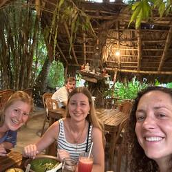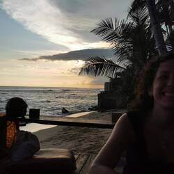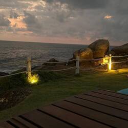 Wir fuhren zur Unterkunft, machten uns frisch und direkt gings weiter mit dem Tuktuk zum 'The Cliff', einem Restaurant, ganz am Rand von der Bucht, mit schönem Blick aufs Meer und theoretisch auch auf den Sonnenuntergang. Als wir nach vorne zum Klippe geführt wurden, waren wir schon beeindruckt. Der Fels war mit Gras bewachsen und überall lagen Sitzsäcke und Kissen an kleinen Tischen, richtig gemütlich. Lulu hatte anscheinend zum richtigen Zeitpunkt reserviert, denn wir wurden bis ganz nach unten an den vordersten Platz geführt. WOW wie cool! Jetzt fühlten wir uns schon wie so kleine VIPs, die Aussicht war der Hammer! Das Essen konnte leider absolut nicht mit dem Platz mithalten und einen richtigen Sonnenuntergang gab's auch nicht, weil wieder bewölkt... 🤷🏼♀️ Wir genossen den Blick trotzdem bis es dunkel wurde :)