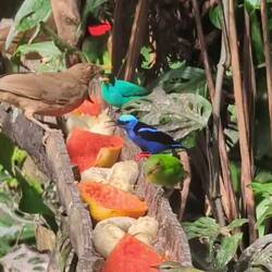 In aller Früh ist schon einiges los an der Futterstelle, Vögel in allen Größen und Farben.