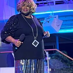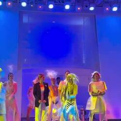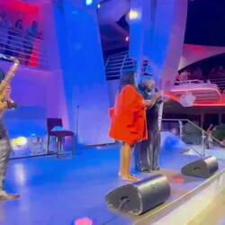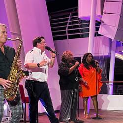 Zurück an Bord genießen wir wieder einen tollen Sonnenuntergang 🌅 bei einem leckern Wein 🍷 und die Abendanimation hat eine kleine Überraschung parat: ein Weather Girl (Dynelle Rhodes) ist mitBaca lagi