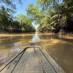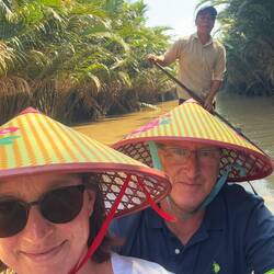 Mit unserem Guide Huu fahren wir erst die ca. 2,5 Stunden zum Mekong River und steigen dort in ein Motorboot. Die Boote, die Augen haben, sollten früher vor den hier lebenden Krokodilen geschütztBaca lagi