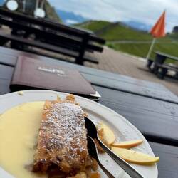 Oben angekommen genießen wir die schöne Aussicht und stärken uns auf der Hütte mit dem obligatorischen Käsebrot und einem Apfelstrudel - lecker 😋